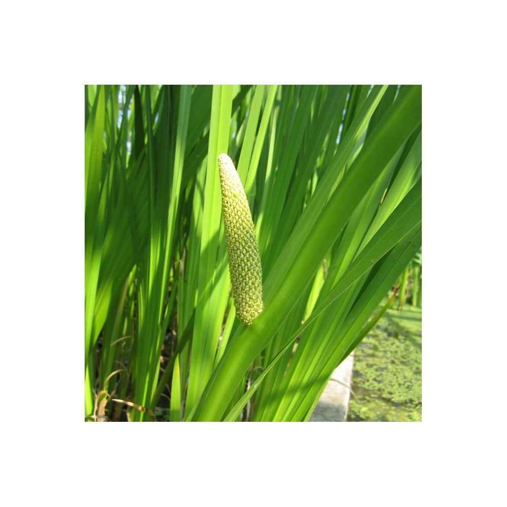 Dark green iris-like foliage with a small green horn-shaped bloom. It grows from a rhizome which runs across the ground out of which the leaves rise up. It has been used in fragrances and medicinal cures since Egyptian times. Little maintenance is required. Trim just above the water surface after foliage has died back in Autumn to tidy leaving a little material to protect new shoots.