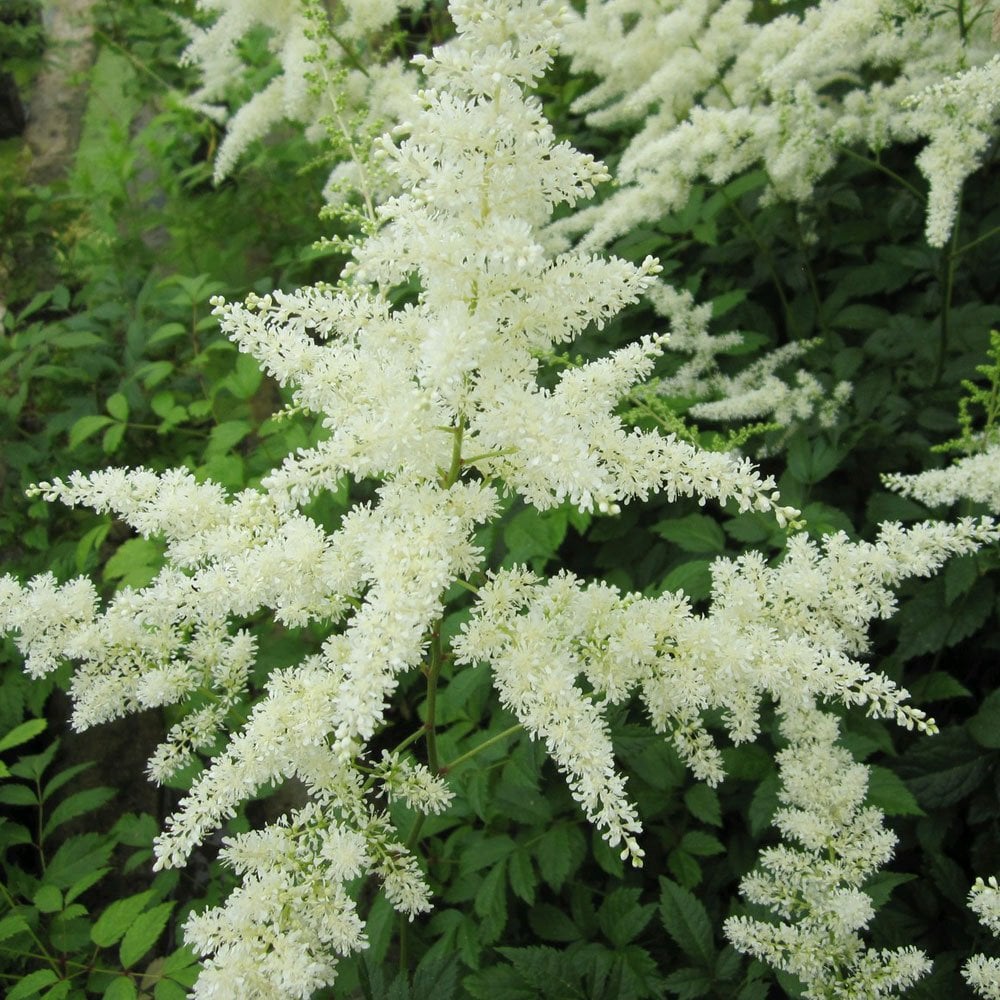 Arching plumes of fluffy white flowers. Grows better in shaded areas and must be kept moist. Trim back dead foliage in Autumn.