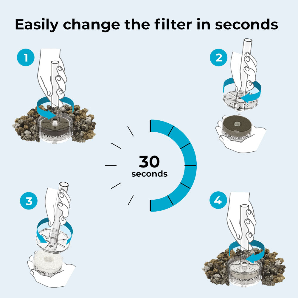 Like all Biorb's, the BiOrb TUBE 30 MCR uses the same proven filter technology as the rest of the BiOrb aquarium range. The ceramic media provides biological filtration which has a surface area equivalent to the size of a football pitch. Any excess waste is collected and held in a filter cartridge at the base of the BiOrb. To maintain your BiOrb TUBE Aquarium all you need do is simply replace the filter cartridge every four weeks and change a third of the water.