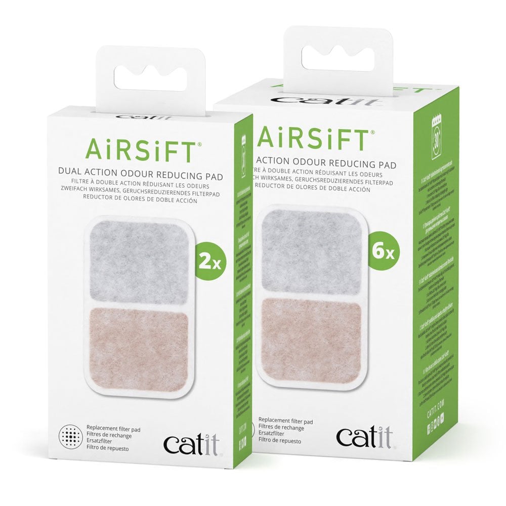 Catit Airsift Dual Action Pads combine the powerful Catit Magic Blue Ammonia Buster with the power of activated carbon, effectively locking in any nasty litter box odours. These filter pads are designed for use with Catit Airsift Hooded Litter Boxes, and should be replaced every 30 days for optimal results.
