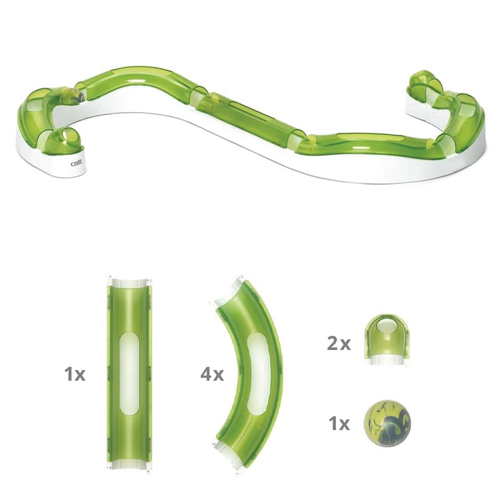 The Catit Senses 2.0 Wave Circuit includes 1 straight part, 4 wavy curved parts with top opening, 2 end parts and 1 circuit ball.