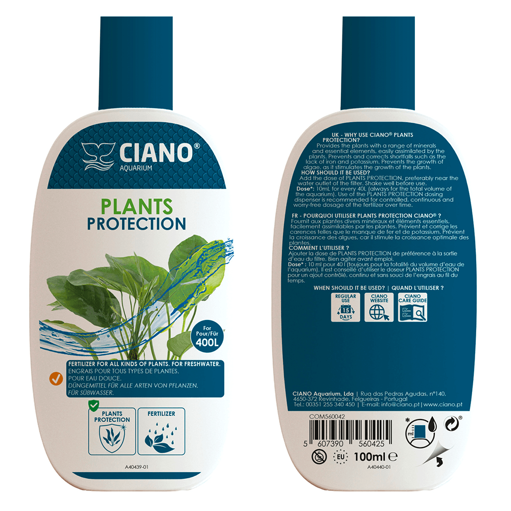 The Ciano Plants Protection solution provides plants with a range of minerals and essential elements, easily assimilated by the plants. The easy to use Plant Protection additive will prevent and correct shortfalls such as a lack of iron and potassium whilst also helping prevent algae growth, as it stimulates the growth of the aquarium plants.