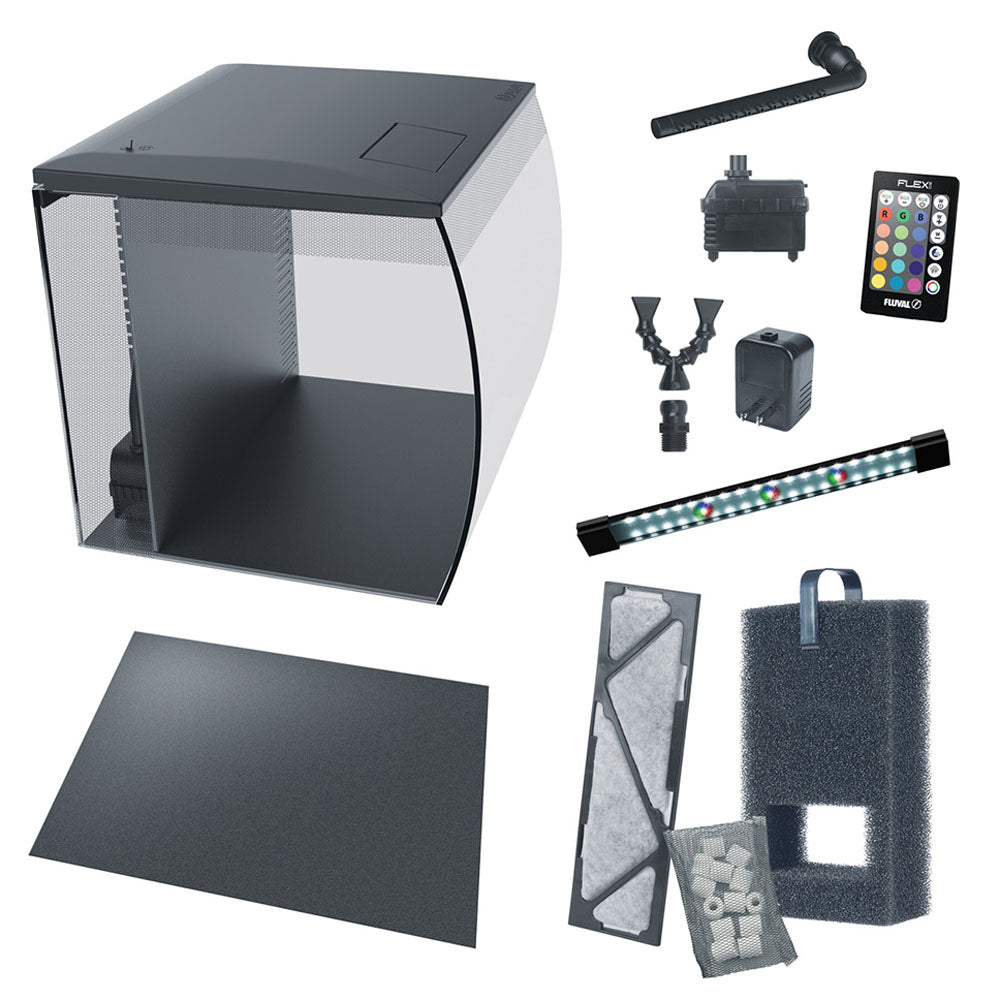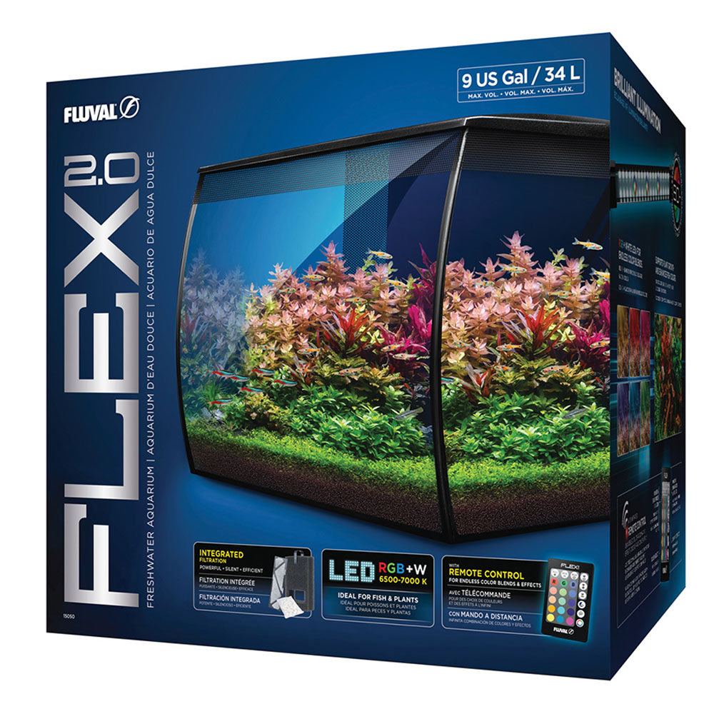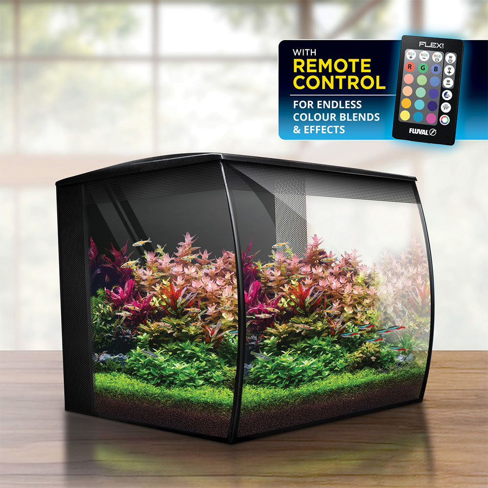 Introducing the new and improved Fluval Flex 2.0 Aquarium Kit range. Discover the ultimate in freshwater fish tank design and flexibility with customisable RGB + White LED lighting for endless colour blends and mesmerising effects. The latest Flex 2.0 Aquariums take convenience to the next level with several new enhancements, including a reconfigured, integrated filtration system with adaptable water output options.
