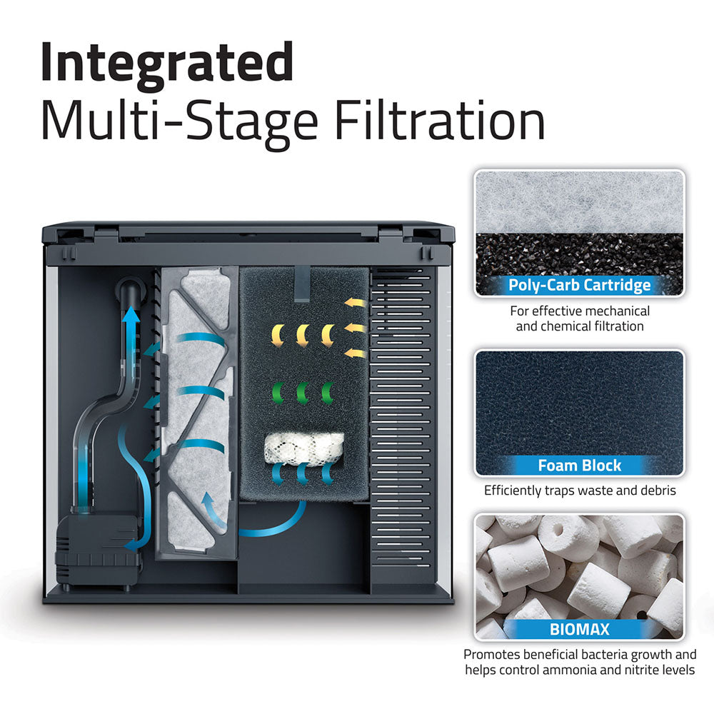 - RGB + White LED lighting supports live plant growth and enhances fish colours
