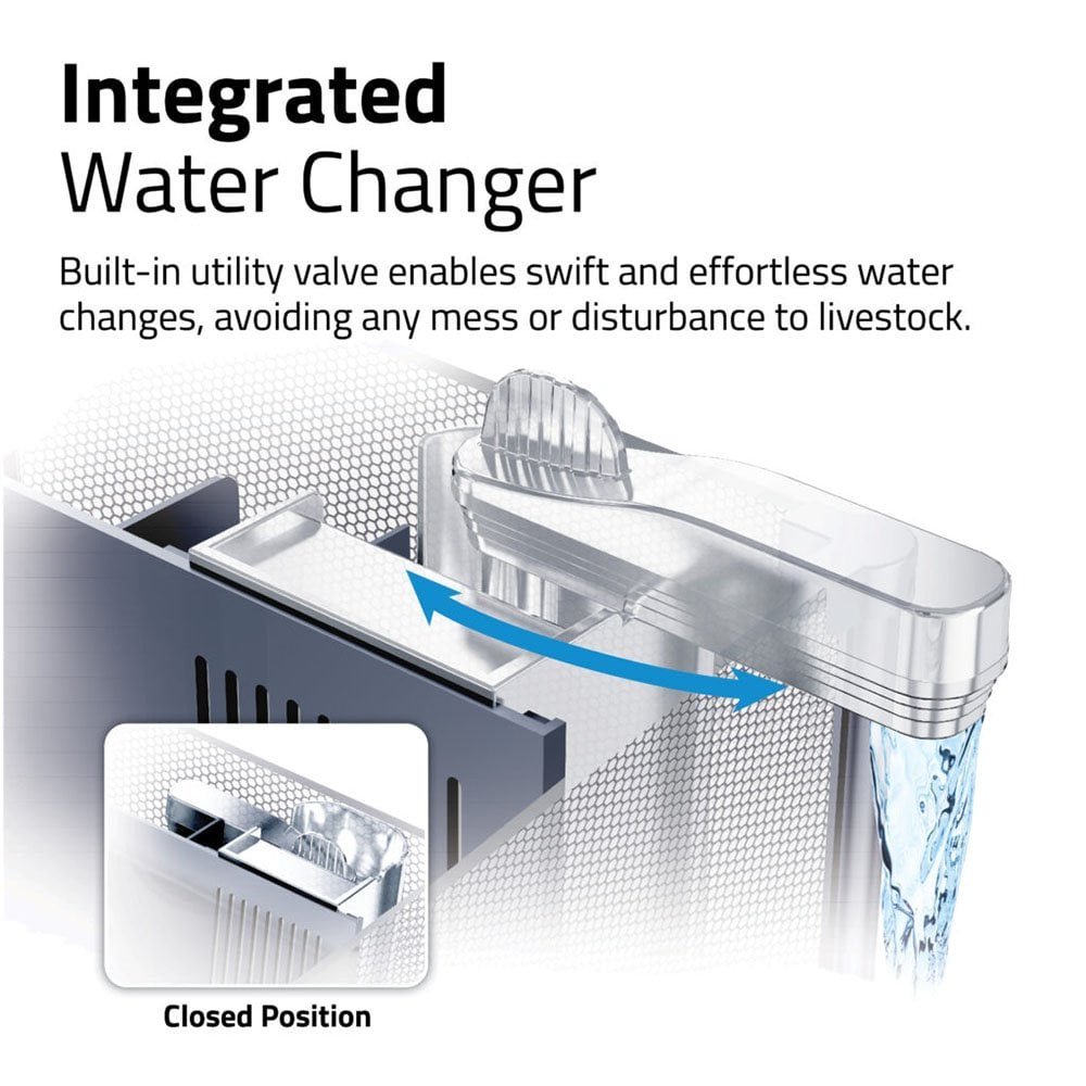 Integrated utility valve enables swift and effortless water changes, avoiding any mess, disturbance to livestock, or the need for additional tools.