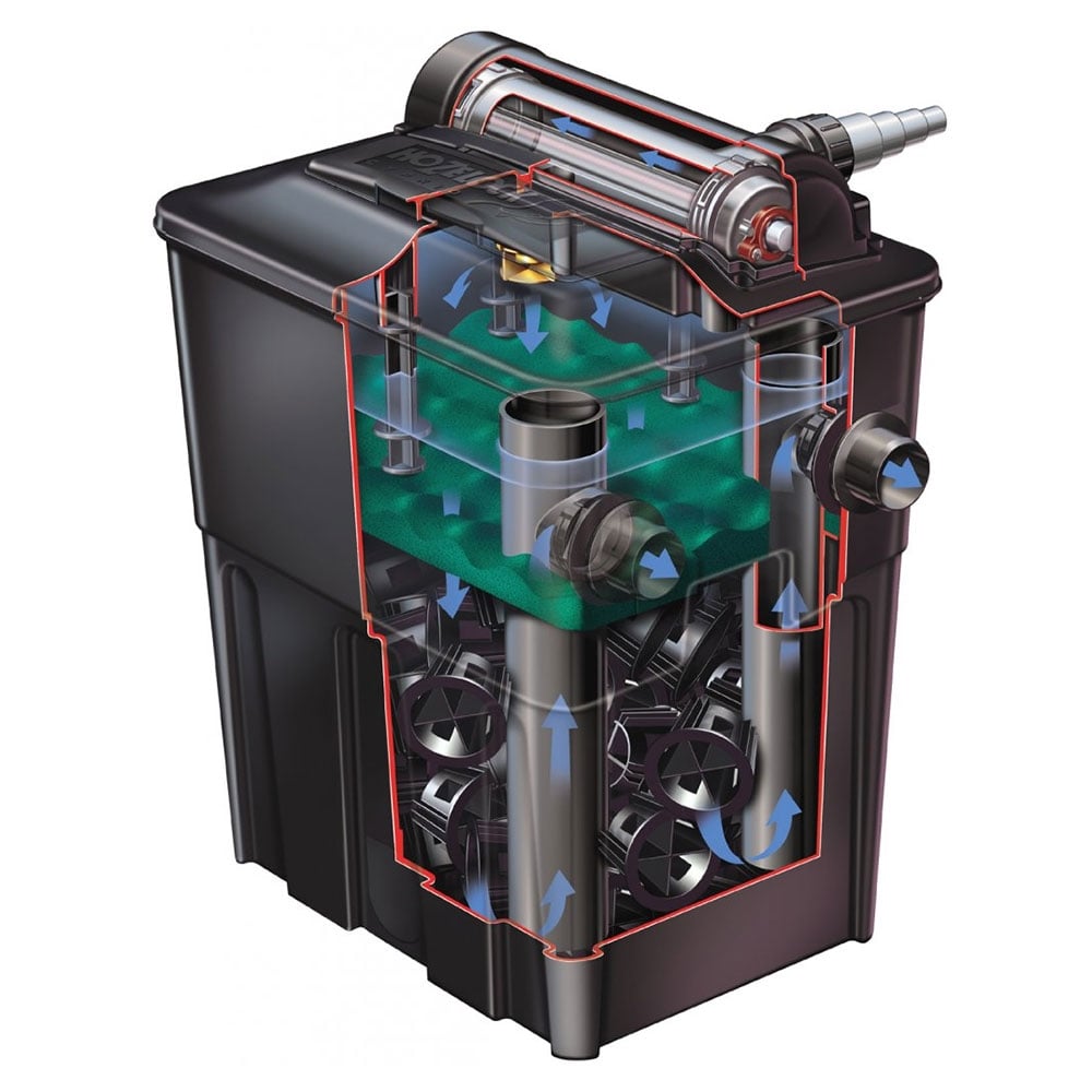 - Almost solids free water then passes through plastic biomedia where beneficial bacteria cleanse pollutants. The amount of biomedia contained in the filter increases in direct proportion to the size of the pond/filter to support a greater number of fish.