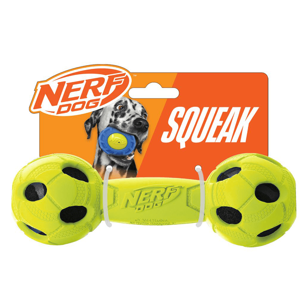 The Nerf Dog Rubber Bash Wrapped Tennis Barbell will keep your dog entertained for hours on end. Packed with tail wagging fun, the Rubber Bash Wrapped Tennis Barbell has not one, but two satisfying squeakers making it great for interactive or solo play sessions.