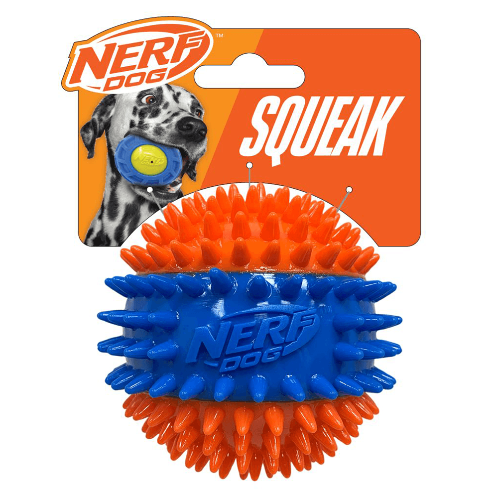 The Nerf Dog Spike Squeak Ball will entertain your dog for hours on end. Perfect for throw and fetch games the Spike Squeak Ball incorporates dental chew spikes for healthy teeth and gums. The durable dog toy stands up to extended chewing and is great for interactive or solo play sessions.