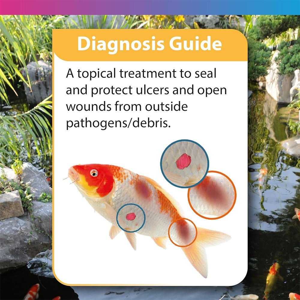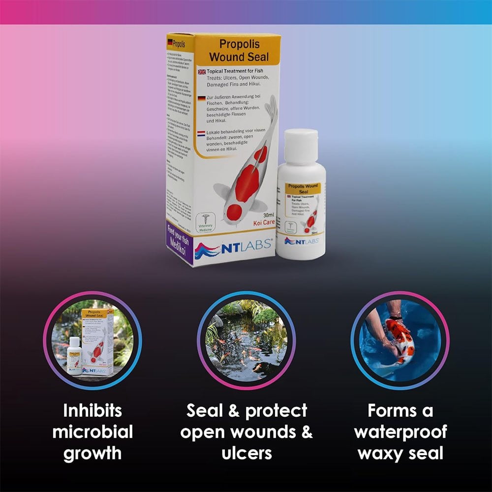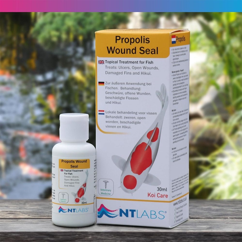 NT Labs Koi Care Propolis is a topical treatment used to help seal fish ulcers, open wounds, damaged fins and Hikui. Propolis is a waxy substance produced by bees to protect their hives from infection. NT Labs Propolis is supplied as a thick, dark brown liquid for easier application and lasting protection when fish are introduced back into pond water. NT Labs Koi Care Propolis can be spread over cleaned and dried ulcers and wounds to form a waxy seal.
