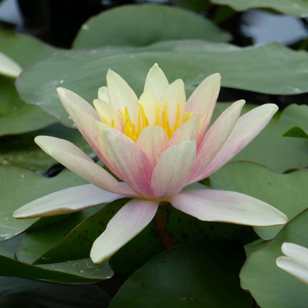 The flowers of this beguiling water lily open apricot-yellow, and mature to a graceful orange-pink. The foliage displays attractive maroon spots. Plant in still water away from splashing fountains. Lower gradually so the leaves can stretch to the surface within a few days. Remove dead leaves and flowers during the growing season.