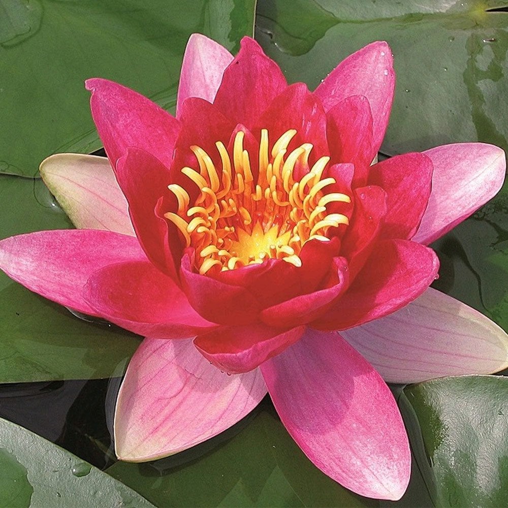 Beautiful, fragrant, bright red flower with lighter edges. Prolific & long bloomer. Foliage dark green, almost round leaves. Plant in still water away from splashing fountains. Lower gradually so the leaves can stretch to the surface within a few days. Remove dead leaves and flowers during the growing season.