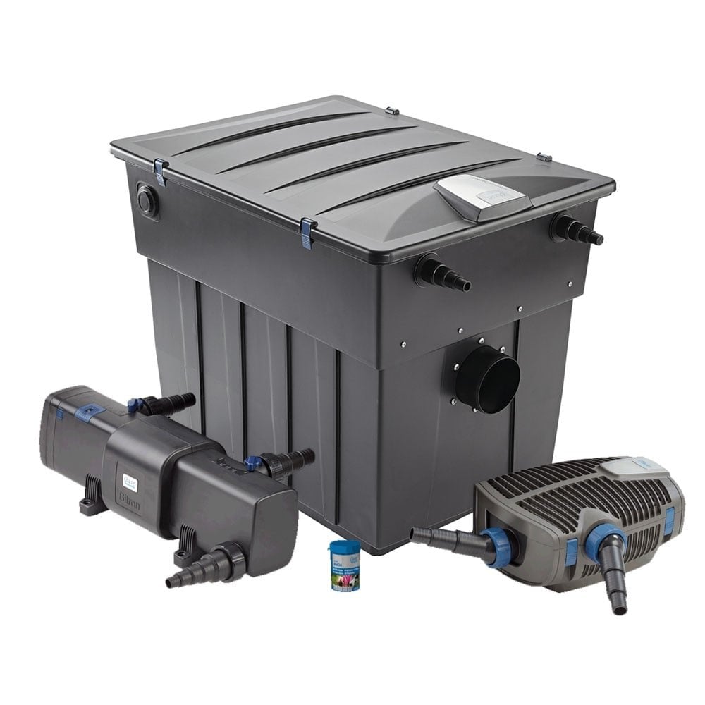 The Oase BioTec ScreenMatic² Set 90000 OC consists of the BioTec ScreenMatic² 90000 Pond Filter, the AquaMax Eco Premium 21000 Pond Pump and the Bitron 110C UVC. This optimally matched pump, filter and UVC set provides crystal clear water for ponds up to 90,000 litres.