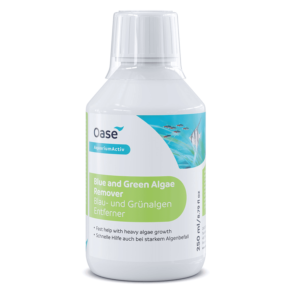 A mass breakout of algae not only looks ugly, but can also cloud the water and even damage life in the aquarium. The occurrence of algae plagues indicates a nutrient imbalance that should be remedied. However sometimes immediate, direct action is required to combat the unsightly growths. Oase Blue & Green Algae Remover contains a complex mix of active substances which inhibits the metabolic process of algae, preventing them from carrying out photosynthesis and thus slowly starves them out. AquariumActiv Blue & Green Algae Remover fights the most common species of algae effectively to deliver long-term results.