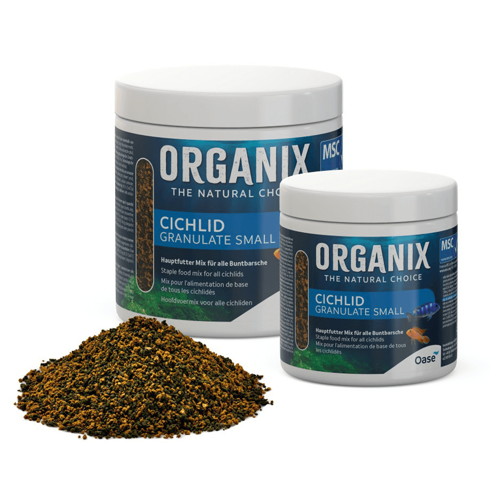 Organix Cichlid Granulate from Oase has been specially formulated to provide a balanced diet to meet the needs of the species-rich family of omnivorous cichlids. Oase Organix Cichlid Granulate Small is a granule food designed to cater for smaller cichlid species. Cichlid Granulate provides the optimal combination of proteins, fats, carbohydrates, vitamins and trace elements from sustainable seafood making it ideal for everyday feeding, to deliver all the important building blocks that cichlids need to lead a healthy and active life