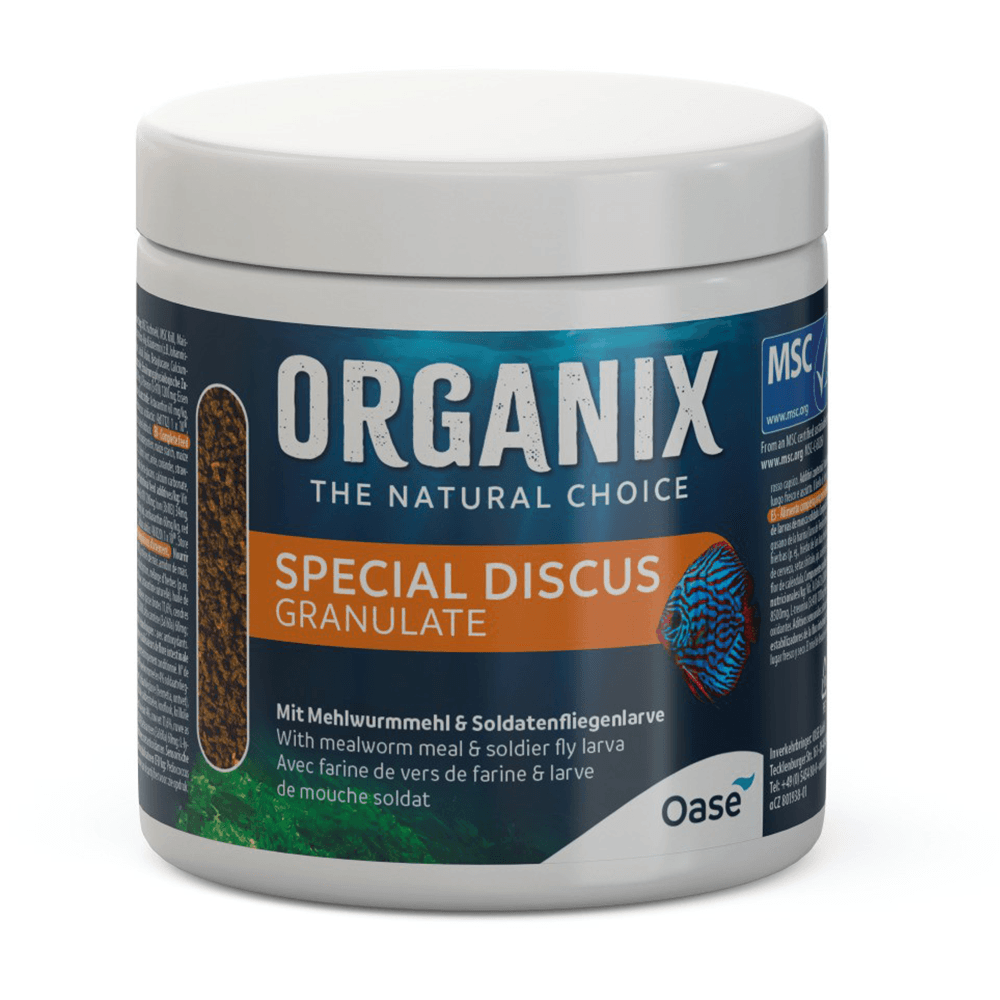 Oase ORGANIX Special Discus Granulate has been created to precisely tailor to the needs of demanding Discus. ORGANIX Special Discus Granulate contains aquatic raw materials and does not use wheat. The natural flavour of garlic effectively supports intestinal cleansing and the health of the digestive system. The power algae mix is supplemented by the shiitake fungus, whose valuable components have a prebiotic effect. Special added bacteria promote digestion by supporting the intestinal flora. Colouration pigments such as red pepper (capsicum-oleoresin), salmon oil, beta carotene and canthaxanthin contribute to the full colouration of aquarium inhabitants. These pigments can be optimally utilised by the fish and support the radiance and beauty of the fish. Last but not least, soldier fly and mealworm ensure that the granules taste great. The ORGANIX Special Discus granule shape protects the rich ingredients and different granule sizes in a pack enable stress-free food intake at differing swimming levels.