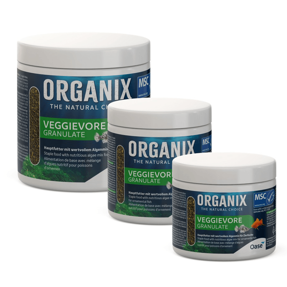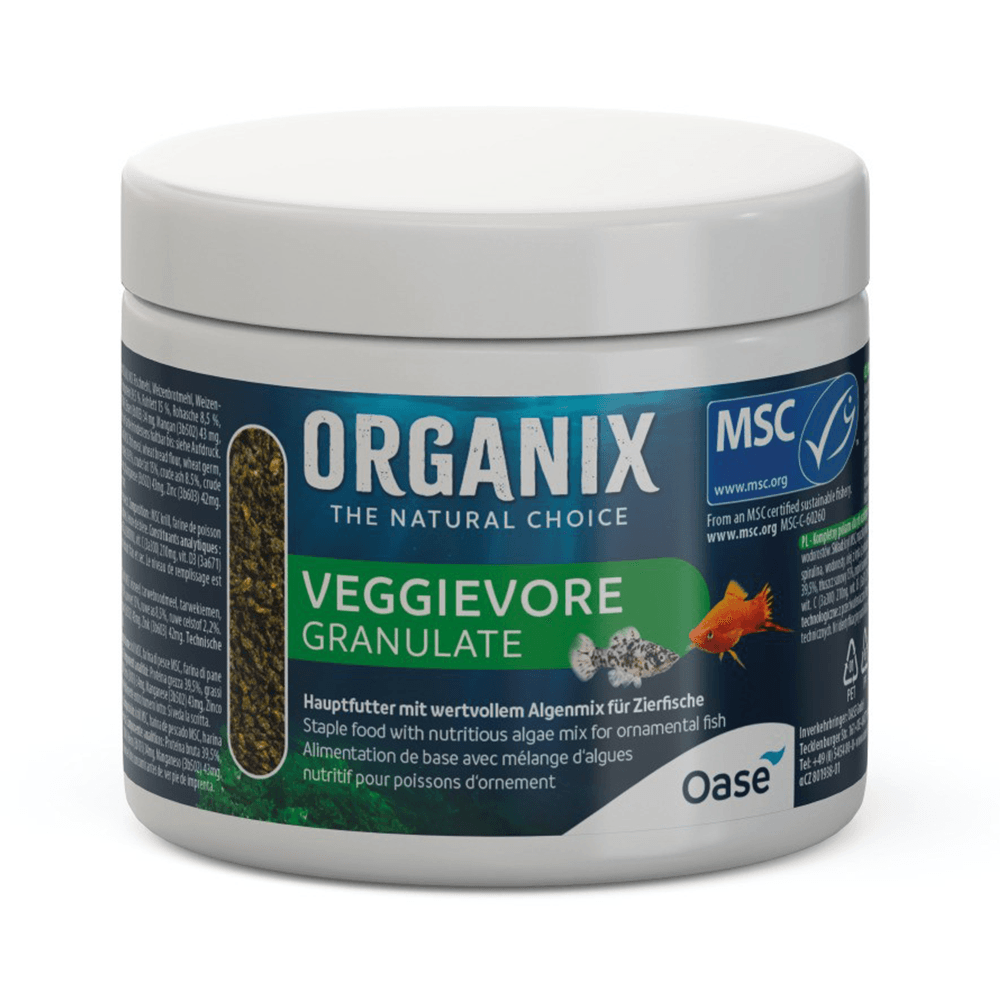 Oase ORGANIX Veggievore Granulate ensures the complete feeding of predominantly herbivorous aquarium inhabitants. Thanks to their varying sinking speed, granules of varied sizes in a pack ensure that every fish can eat in peace at its natural swimming level. ORGANIX Veggievore granules boast a special swelling speed to ensure that the rich ingredients remain protected for longer, such as the nutrients and vitamins from the special algae mix. With 4.6% chlorella algae, 4.6% spirulina and 4.6% mineral-rich kelp, ORGANIX Veggievore Granulate adds algae power to the menu and provides predominantly herbivorous species with exactly what they like most.