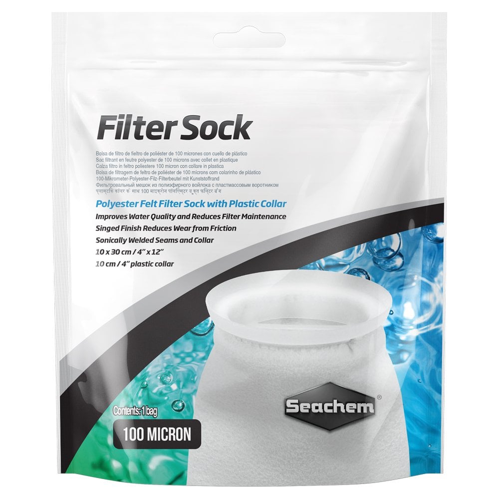 In addition to a 100 micron rating for exceptional particulate removal, Seachem Filter Socks feature welded seams, which, unlike threaded seams of similar products, will not breakdown over time. They have a singed finish, which reduces wear and prevents release of fibres back into the water column. Finally, the plastic collar simplifies installation and easily fits standard sump fittings.