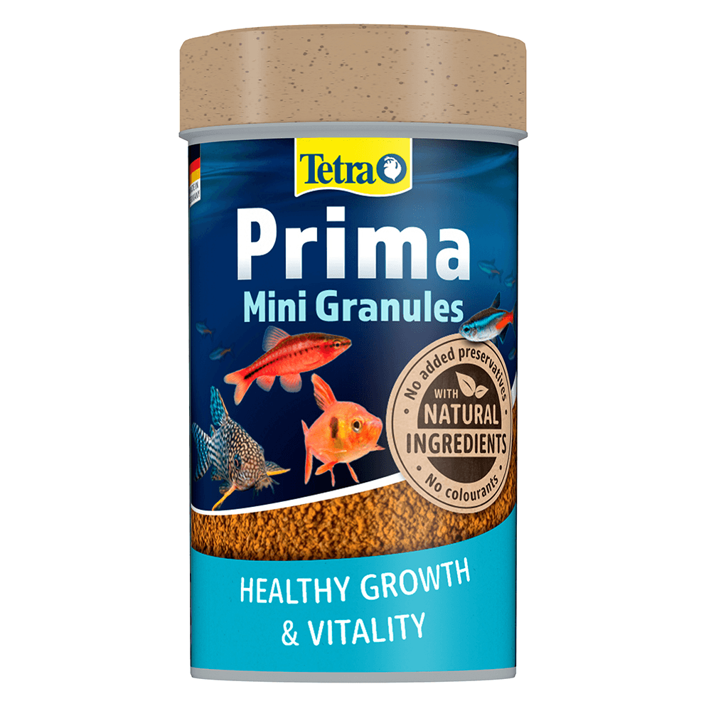 Tetra Prima Mini Granules provides a complete food for small mid-water and bottom-feeding fish. Prima Mini Granules contain a mix of herbivore and omnivore granules to cater for different dietary needs in a mixed community aquarium. The slow-sinking granules allow mid-water and bottom-feeding fish to feed naturally and contains Tetra Active Formula for a healthy immune system.