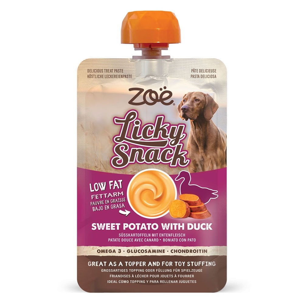 Zoe Licky Snack Sweet Potato & Duck is a smooth, delicious treat paste that’s sure to keep your dog happily licking for more! Made with easily digestible pumpkin, it’s gentle on sensitive stomachs. Low in fat, it’s the perfect treat or food topper without overloading your dog’s diet. Pair with Zeus ChewChasers toys to turn playtime into a fun and tasty experience.